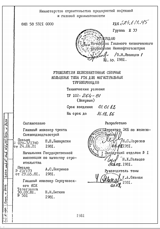 ТУ 102-264-81. Утяжелители железобетонные сборные кольцевые типа УТК для магистральных трубопроводов